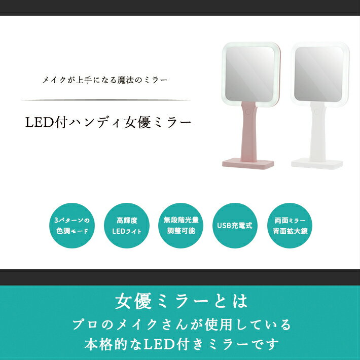 LED 女優ミラー ハンディタイプ 充電式 持ち運び 手鏡 大きめ ハンディミラー 両面ミラー 拡大鏡 ハンドミラー コンパクトミラー 卓上ミラー 女優鏡 メイク ライト付き メイクミラー 照明 USB おしゃれ 明るい クリスマスプレゼント