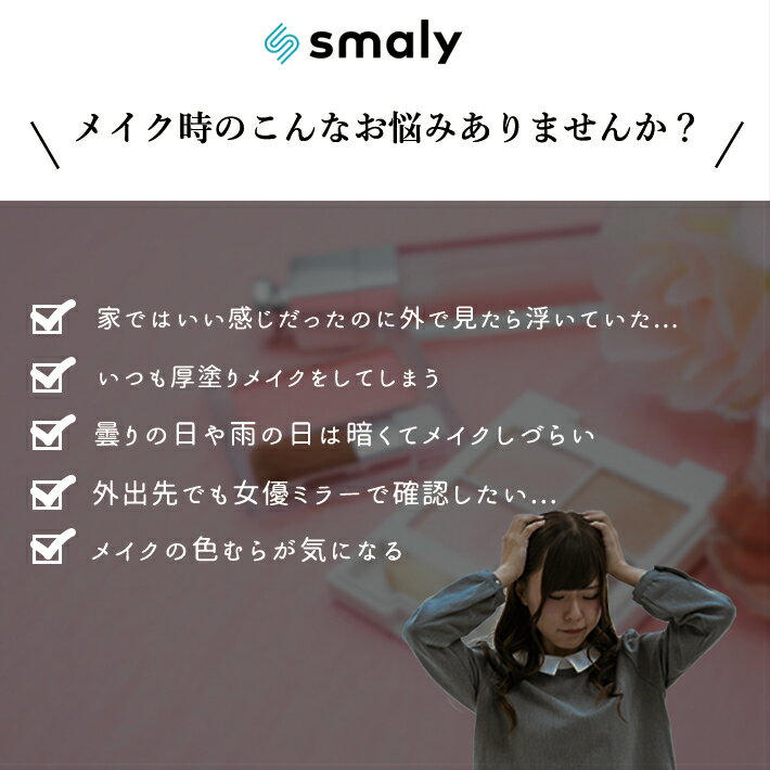 商品名 LED付き女優 ハンディミラー機能・3種類の色調モード ・高輝度LEDライト搭載・無段階の光量調整機能・USB充電式・両面ミラー(背面5倍拡大鏡)仕様 本体サイズ:高さ約26cm*横約12.5cm*厚さ約2cm充電電池:リチウムイオン電池600mAh 充電時間:約1.5-2時間連続使用時間:約1-2時間(使用状況により前後します)調色:昼光色・昼白色・電球色 材質:ABS・ガラス付属品 ・ハンディミラー本体・充電用USBケーブル ・卓上スタンド・日本語取扱説明書注意事項 ※本商品はSmaly正規商品です。