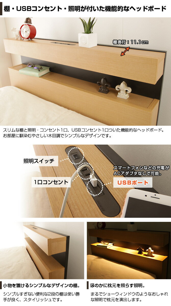 ■商品サイズ:幅122×奥行208×高さ91cm 【フレームについて】 ■引き出し内寸:幅86.5×奥行37×高さ14.5cm×2杯 ■長物収納:幅68×奥行192×高さ16cm ■材質:プリント化粧板 ■塗装:ウレタン塗装(着色) ■仕様:LED照明4灯付、USBコンセント1口・コンセント1口付 ■生産国:日本 ■お客様組立品(2人約30分程度) 【マットレスについて】 ■サイズ:幅122×奥行195×高さ23cm ■材質:詰め物/ウレタンフォーム、フェルト、側生地/ポリエステル46%・ポリプロピレン54% ■スプリング:たる形ばね(袋入) スプリング数600 (線経1.87mm) ■生産国:日本スタイリッシュな照明が4灯と、コンセント1口・USBコンセント1口ついた機能的なヘッドボード。